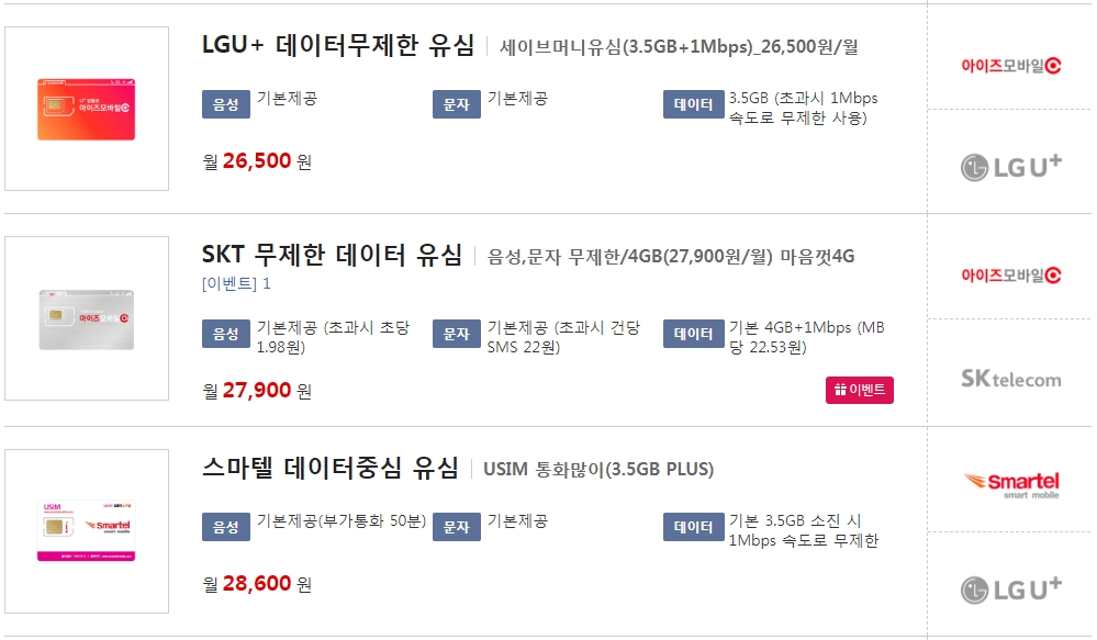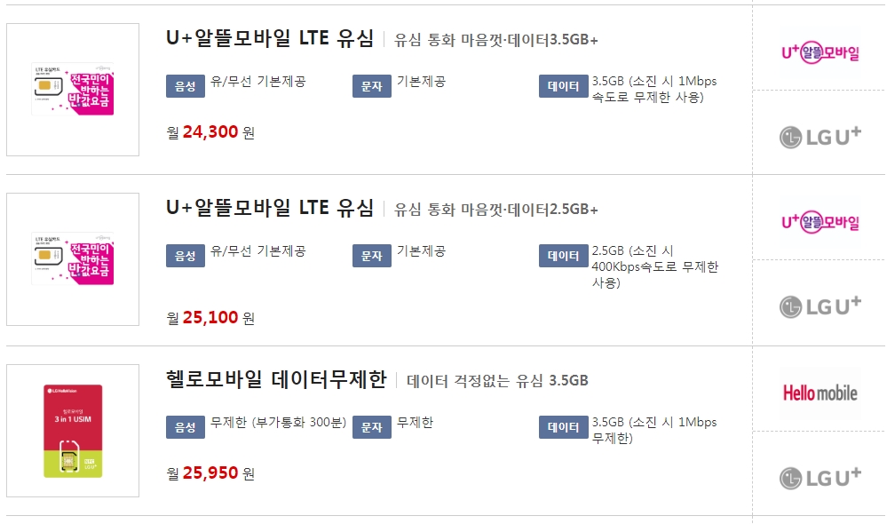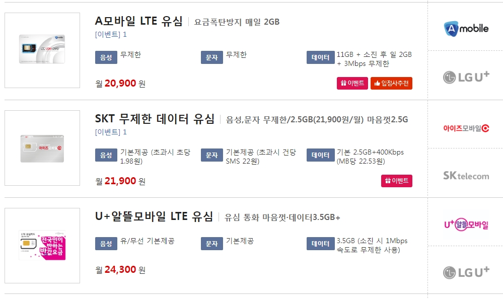 이게 매번 있는게 아니라서 검색하는 이 순간에만 있는 상품이구요. 딱히 이벤트가 없는 것은 월 24,300원 짜리입니다. 데이터 3.5GB 소진시 1Mbps 속도로 무제한으로 사용할수 있는 요금이 가장 저렴하네요.